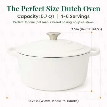 Show more Experience the ultimate cooking journey with our exquisite 5.7 quart Dutch Oven from Larder and Vine, a versatile kitchen essential ready to elevate your culinary skills. Perfect for simmering hearty soups or baking crusty bread, this Dutch oven seamlessly transitions from stovetop to oven, making meal preparation a delightful and effortless task. Its stunning design and vibrant color will not only complement your kitchen decor but also impress your guests with its impressive functionality.