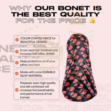 Show moreIntroducing the Large Bonnet - Silky Satin Bonnet with Elastic Soft Band (Red Black Bonnet), where enchanting aesthetics meet practical hair care! This exquisite bonnet embraces both style and functionality with its stunning Slayer Red and Black design, perfect for anime lovers and cosplay enthusiasts. Crafted from a blend of premium polyester satin and silk, this gorgeous hair cap is designed to cater to various hair types—from natural curls to protective styles. Say goodbye to bad hair days as it locks in moisture and enhances shine while providing a breathable experience that feels luxurious against your skin.