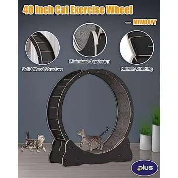 Show more The **Large Cat Exercise Wheel** is the ultimate fitness solution for your feline friend, designed to provide an engaging way for cats to exercise indoors. Crafted from durable and sustainably sourced **black solid wood**, this cat wheel not only looks elegant but is built with your cat's safety in mind. Featuring a minimized gap of less than 6mm between the base and roller, you can rest assured that your cat's paws will be safe from pinching as they run. The wheel’s generous size (40" diameter) provides ample space, allowing cats to run freely while keeping their spine safe and well-aligned. Whether for play or exercise, this cat wheel is an essential addition to a cat-friendly home.