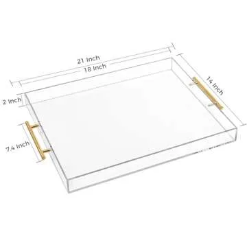 Show more Elevate your home organization and style with our Large Clear Acrylic Serving Tray, measuring 14×18 inches and adorned with elegant gold handles. This exquisite piece is not only visually stunning but also incredibly functional, designed to cater to a variety of uses in your home. Made from high-quality acrylic, the tray features safety rounded edges and corners, making it both durable and aesthetically pleasing. Perfectly crafted for the environment-conscious homeowner, this acrylic serving tray offers an upscale look that enhances any décor.