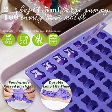 Show more The LUSHYUM Gummy Mold is an innovative and essential kitchen tool for any candy lover. This outstanding set includes both gummy bear and gummy worm molds, allowing you to create a staggering total of 70 large gummy bears and 30 large gummy worms at one go. Each gummy bear stands at a charming height of 1.15 inches and is crafted with meticulous detail to provide an adorable and scrumptious treat. With a generous 5ml cavity for bears and options of 6ml or 12ml for worms, your candy-making creativity is limitless.