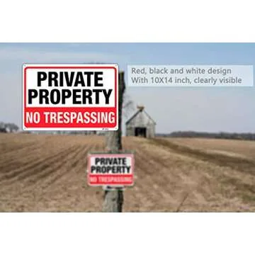 Why You Will Love This Product? The **Large Private Property No Trespassing Sign** not only serves a necessary function but also brings an added layer of security to your home or business. Knowing that your property boundaries are clearly marked allows for peace of mind in today's world. With its eye-catching colors and substantial size, you can feel confident that your message is loud and clear, effectively communicating your property rights while fostering a secure environment.