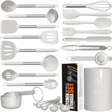 Show more Experience culinary excellence with the Large Silicone Cooking Utensils Set, your perfect kitchen companion! This meticulously crafted 18-piece collection is a fusion of 304 stainless steel handles and food-grade silicone heads, promising durability and style. Versatile enough for all your cooking needs, this set features tools designed for maximum efficiency, capable of withstanding temperatures up to 446°F. Ideal for any chef, from novices to seasoned pros, these utensils are the epitome of kitchen innovation.
