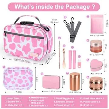 Show more The **Large Smell Proof Bag with 11 Small Items by BOYISTARG** is the ultimate solution for anyone seeking safe and discreet storage. With its charming **Cute Cow Print** design in pink and white, this portable storage case combines style with functionality. This premium accessory box is meticulously crafted to include a comprehensive set of **11 essential accessories**—everything you'll need to keep your valuable items organized and secure. From a high-quality aluminum grinder to a variety of storage solutions, this box is tailored for versatility and ease of use, making it your go-to storage solution!