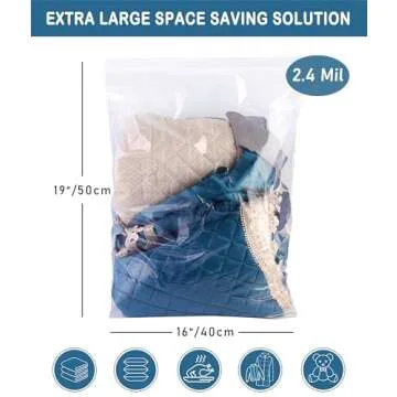 Not just for storage, these resealable large storage bags provide a practical solution for maintaining freshness as they feature a sturdy zipper that effectively seals in moisture to keep your items dry and free from unwanted odors. This means your belongings remain pristine, helping you to neatly organize your garage, attic, pantry, or laundry room with ease. With these bags, you can bid farewell to clutter and the risk of items spilling or getting damaged.