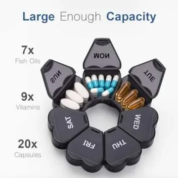 Show moreIntroducing the KAPENS Large Weekly Pill Organizer, your ultimate solution for maintaining an organized and convenient approach to daily medication management. Designed with a spacious capacity, this innovative pill box measures 5 x 5 x 1 inches, featuring 7 slots that can comfortably hold up to 7 fish oil capsules, 9 vitamins, or 20 standard capsules per compartment. No more rummaging through messy drawers or juggling multiple pill bottles while you navigate your busy schedule. The KAPENS pill organizer not only simplifies your pill-taking routine but also adds a touch of charm with its sleek and practical design, making it a delightful addition to your everyday essentials.