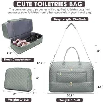 Show more This exceptional Travel Tote Bag with a shoe compartment has been thoughtfully designed for the modern woman on the go. Whether you're headed for a weekend getaway, a gym session, or a hospital visit, this versatile bag has you covered. Crafted with high-quality materials, this bag includes a complimentary toiletry bag worth $15, perfect for organizing your cosmetics and essentials.