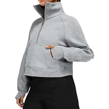 LASLULU Womens Fuzzy Cropped Sweatshirt Hoodies Sport Athletic Zip Up Stand Collar Sweater Fleece Lined Fall Sweatshirt Long Sleeve Pullover Tops Pockets(Light Grey Small)