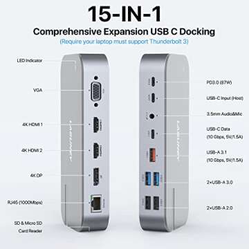 Introducing the LASUNEY 8-in-1 USB C Hub, a revolutionary docking station that enhances your workspace with superior connectivity and efficiency. This compact and stylish hub boasts a myriad of functionalities that cater to your every tech need. Designed particularly for Type-C laptops, it features an impressive array of ports including 1 Ethernet/RJ-45 Port, 1 USB/Type-C Female PD charging port, 1 HDMI port, and 3 USB 3.0 ports....