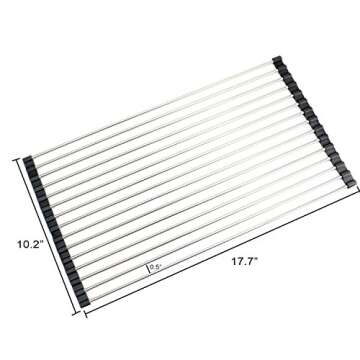 Show moreIntroducing the Lauliven Over The Sink Roll Up Dish Drying Rack – a perfect blend of functionality and versatility. Designed to elevate your kitchen experience, this innovative dish rack measures 17.7"L x 10.2"W x 0.5"H. Crafted from high-quality 304 stainless steel with non-slip silicone grips on both ends, it ensures stability and resilience even during constant use. Its solid and sturdy construction is resistant to rust, making it a reliable companion in your kitchen for years to come. Before purchasing, please ensure to measure your sink dimensions to confirm a proper fit.