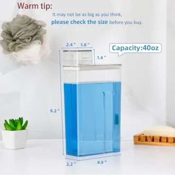 Show more Discover a game-changer for your laundry room – the innovative **Laundry Soap Dispenser**! This stylish and practical dispenser boasts a generous capacity of 40 ounces, ensuring ample storage for all your laundry essentials. Its unique design allows for easy refilling and use, with liquid flowing back effortlessly after dispensing, meaning no more messy spills on your washing machine. Say goodbye to the cumbersome detergent boxes and embrace a more organized and visually appealing solution!