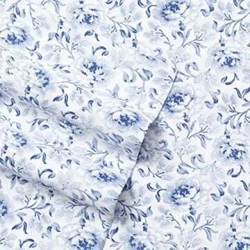 Show more Indulge in the luxury of a restful night's sleep with the Laura Ashley Lorelei Cotton Sateen Sheet Set. Made from 100% premium cotton, these sheets are designed to provide ultimate comfort and breathability. The fabric features a sumptuous 300 thread count that ensures a soft, silky touch against your skin, promoting a cozy sleep environment. The stunning dark blue floral design adds an elegant touch to any bedroom decor, making it not just a necessity, but a fashion statement.
