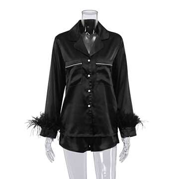 LAVASEON Womens Feather Trim Pajamas Set of 2 Button Up Long Sleeve Satin Blouse Shirt Shorts Sleepwear Black