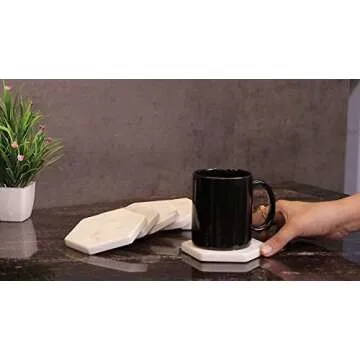Show moreIntroducing the LAVAUX DESIGNS Set of 6 Hexagon Marble Coasters, the perfect blend of style and functionality for today’s modern home! Crafted from 100% solid real white marble, these coasters stand out with a stunning minimalistic design that enhances any decor setting. With a thickness of 10 mm, they not only prevent unsightly water stains on your precious furniture but also add an elegant touch to your coffee table, dining area, bar, or office. Their unique texture and stunning hue make them an eye-catching centerpiece while offering protection for your surfaces.