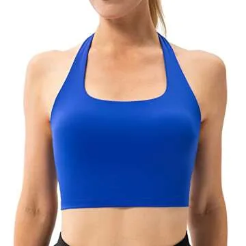 Lavento Women's Halter Sports Bra Pleated Longline Padded Yoga Crop Bras Top (Bright Cerulean Blue, 6)