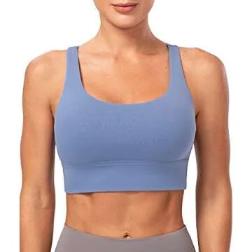 Lavento Women's Strappy Sports Bra Long Line Medium Support Energy Workout Training Top (2026 Baby Blue, Small)