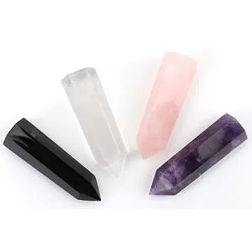 Lawei 4 Pack Natural Healing Crystal Wands - 0.6 x 2.4 inch 6 Faced Black Obsidian, Rose Quartz, Clear Quartz and Amethyst Crystal for Chakra, Reiki, Healing, Energy Work