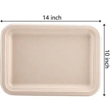 Show more Introducing the ultimate dining solution for your gatherings - this 50 pack of large-capacity rectangle dinner plates boasts each plate measuring a generous 14 x 10 x 0.8 inches. Perfectly designed with ample space, these plates allow for a substantial amount of food, making them the ideal choice for large meals and entertaining. Made from sugarcane bagasse, these plates are not only biodegradable but also compostable, presenting an eco-friendly alternative that is stronger than paper and greener than plastic.