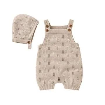 LAWKUL Baby Knit Romper Sleeveless 100% Cotton Jumpsuit with Hat Newborn Outfits Overall Bodysuit One Piece 2pcs Beige 0-6M