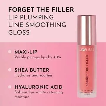 Show more Unveil the secret to irresistibly plump and luscious lips with the Lawless Forget The Filler Lip-Plumper Line-Smoothing Gloss. This luxurious lip treatment offers both immediate and long-term plumping benefits, ensuring your lips look fuller, softer, and beautifully hydrated. With each application, you'll notice how the elegant formula fills in lines and smooths the lip surface, giving you that coveted glass-like shine.