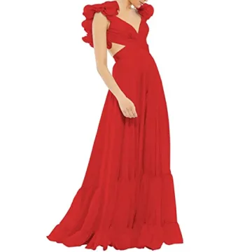 Lawrncedw Women's Chiffon Bridesmaid Dresses Ruffle Backless Prom Dresses V Neck A Line Formal Evening Party Gowns Red