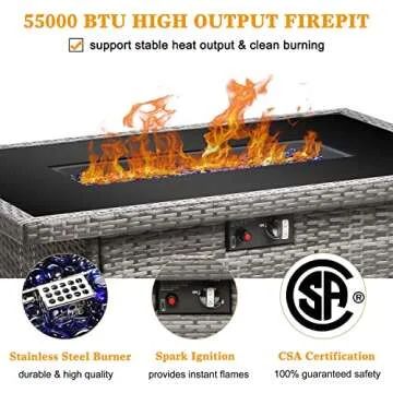Show more Transform your outdoor experience with the LayinSun 44" Propane Gas Fire Pit Table, an exquisite blend of functionality and aesthetics designed for those who cherish warmth and ambiance in their outdoor spaces. Crafted with a sturdy, weather-resistant wicker wrapped around a durable stainless steel frame, this fire pit table is built to withstand the elements while providing a stunning centerpiece for your patio, deck, or garden. With a powerful heat output of 55,000 BTU, the integrated dual-tube stainless steel burner ensures a consistent and efficient flame that enhances your evening gatherings. Whether it's a chilly night or a friend's get-together, feel the comfort of heat without the worry of ash or smoke that wood-burning options entail.