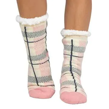Lazy One Plush Nonskid Socks, Fuzzy Socks with Cute Designs for Women, Sherpa Fleece-Lined Socks, Pink Plaid (Bear Hug)