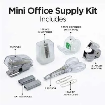 LD Products Clear Mini Office Supply Kit Portable Case with Scissors, Paper Clips, Tape Dispenser Set, Pencil Sharpener, Mini Stapler with Staples and Staple Remover