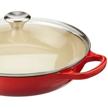 Compatible with all cooktops including gas, electric, ceramic, halogen, induction, as well as being oven and outdoor grill friendly, this cookbook from Le Creuset is truly the all-in-one cooking solution. Enjoy the convenience of a glass lid, which not only gives you a clear view of your culinary delights without lifting the lid but is also lighter than traditional cast iron lids, making it easier to manage while cooking.