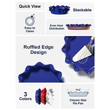 Show more Introducing the LE TAUCI Ceramic Pie Pans for Baking, the ultimate choice for home bakers who appreciate both style and functionality. This beautiful set of two 11-inch deep dish pie plates is perfect for crafting your favorite desserts, whether it's a classic apple pie, savory pot pie, or a delicious quiche. The elegant ruffled edge design not only enhances the presentation of your creations but also aids in making perfectly crimped crusts.