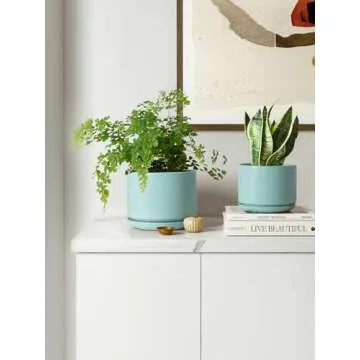 LE TAUCI Ceramic Plant Pots, 4.3+5.3+6.8 inch, Set of 3, Planters with Drainage Hole and Saucer, Indoor Flower Pot with Hole Mesh Pad, Gifts for Mom, Aqua