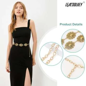 LEACOOLKEY Women Gold Western Concho Chain Belt Boho Metal Western Cowgirl Chain Belt for Dress Adjustable