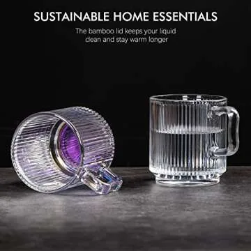Leadiy Transparent Glass Coffee Mug with Lid, Clear Glass Coffee Cups, Classical Vertical Stripes Coffee Mugs for Latte Juice Tea 12.5 Ounces
