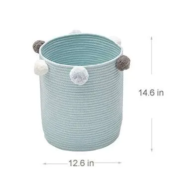 Leadtimes Green Cotton Rope Storage Baskets 12.6" x 12.6" x 14.6" Woven Baby Cute Pompoms Orangizer Bins for Laundry, Cloths, Home Decoration