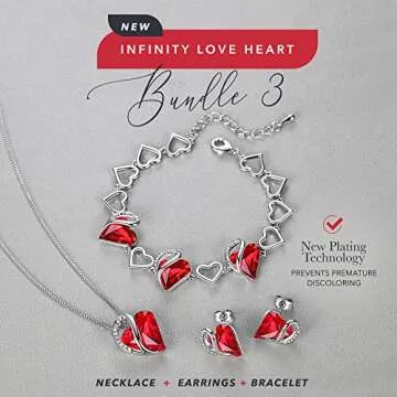 Show more Introducing the Leafael Infinity Love Heart Necklace, Stud Earrings, and Bracelet set, a stunning piece of jewelry crafted for the modern queen. Designed right in Boston, this exquisite set features the breathtaking Siam Ruby Red Birthstone Crystal, symbolizing love and passion for those born in July. With each piece embellished with delicate love heart stones, it exudes elegance and sophistication, making it a luxurious display of affection for any occasion. Whether dressing up for a special event or adding a touch of glam to everyday wear, this set is a must-have for every jewelry collection.