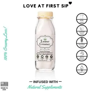 Show moreIntroducing the Leaner Creamer: Natural Coconut Oil Based Coffee Creamer - Original, your new cherished companion for guilt-free caffeination! This revolutionary creamer provides a delightful alternative to traditional coffee creamers, expertly crafted to elevate your beverages without compromising your health or dietary goals. Formulated with a premium coconut oil base, it combines an exquisite vanilla-like flavor with a medley of herbal extracts. Not just a flavor enhancer, it's specifically designed to boost energy and reduce appetite, helping you power through your morning rituals with ease.
