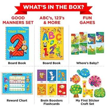 Each component in this innovative learning kit has been carefully crafted to captivate young minds. Our Brain Boosters Flashcards support essential learning areas by reinforcing colors, sounds, numbers, and alphabets. Your little one will delight in the interactive nature of the Where's Baby Game, which promotes logical thinking through enjoyment and play. We also included a Reward Chart that motivates good behavior by encouraging your toddler to say "please" and "thank you".
