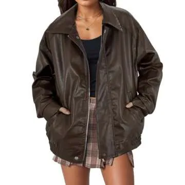 Show moreIntroducing the **Leather Jacket Women Bomber Vintage Pleather Jacket**—the ideal blend of style, comfort, and versatility, perfect for any season! Constructed from high-quality faux leather, this long-sleeve bomber jacket embodies a chic, modern aesthetic while offering the warmth needed for autumn and winter months. The meticulous craftsmanship ensures that you look fabulous while staying snug, while the oversized fit gracefully hugs the body’s natural lines, providing a relaxed yet trendy appearance. With its stand collar and functional zipper, this jacket radiates coolness and practicality.