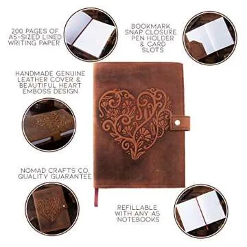 Leather Journal For Women - Refillable Handmade Leather Bound Journal with Lined Paper, Embossed Heart, 200 Pages for Daily Writing, Travel Journal, Diary Notebook
