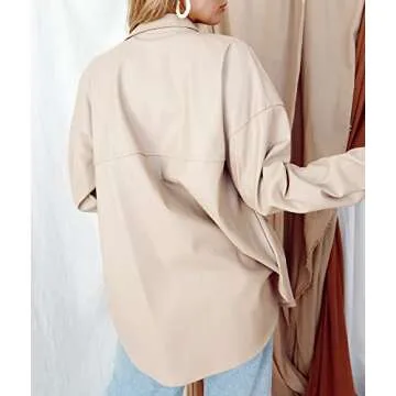 Show moreIntroducing the stunning Leather Shirt Jacket Lapel Button Up Pockets Solid Oversized Shacket Coat in Beige – your new staple outerwear piece that exudes both style and elegance. Crafted from premium faux leather, this jacket features a contemporary oversized design that offers both comfort and trendiness. The lapel collar adds a touch of sophistication, while the button-up closure provides convenience and a classic touch. With functional pockets, this versatile jacket is perfect for layering or wearing on its own during those chilly outings. Embrace your fashion sense with this chic addition that seamlessly transitions from casual to refined outfits.