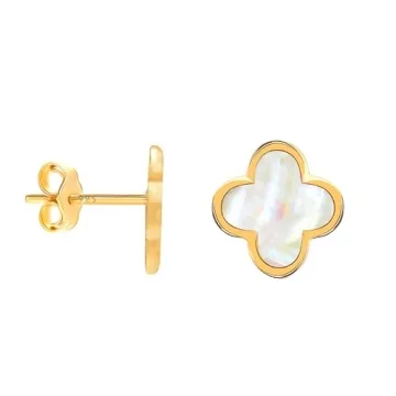 The earrings are made of 925 Sterling Silver with a 14K Gold-Plated finish and feature a Mother of Pearl clover design.