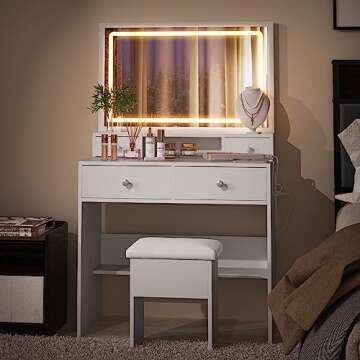 Why You Will Love This Product: Imagine starting your day at this vanity, greeted by the soft glow of adjustable LED lights. Whether you're applying makeup for an important meeting, preparing for an evening out, or filming your next online tutorial, the LECEVOCY Vanity Desk Set elevates the experience. You'll find joy in seeing your cosmetics beautifully organized, and with its stylish finish, your space will reflect your personality. Every element—from the lighted mirror to the chic storage—has been crafted to enhance your daily routine and boost your confidence, making each moment spent in front of this vanity a mini retreat for self-care.