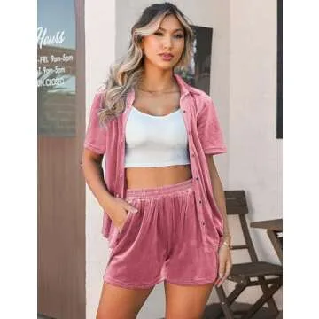 Show moreIntroducing the LecGee Women Velvet Shirt Shorts Short Sleeve Button Down Set, a stylish and comfortable two-piece loungewear outfit that adds a touch of elegance to your casual wardrobe. Made from premium velour fabric, this set perfectly combines luxury and comfort, making it an ideal choice for lounging at home or attending events. It features a chic button-down shirt with short sleeves, accompanied by matching shorts that are tailored for a relaxed yet flattering fit. The delightful pink color enhances its appeal, making it a versatile addition to any wardrobe.