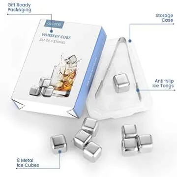 Lecone Whiskey Ice Cubes Reusable Ice Cubes for Drinks, 8PCS Whiskey Stones Set Stainless Steel Ice Cube with Ice Tongs For Whiskey, Vodka, Liqueurs, Wine, Beverage Juice or Soda