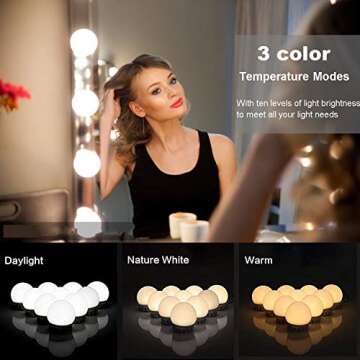 Show more Transform your makeup routine into a luxurious experience with our Professional Vanity Mirror Light. This versatile lighting solution features 14 bulbs with three color modes: sunlight white, warm white, and natural light. Each mode includes 10 brightness levels ranging from 350lm to 1200lm, perfect for simulating various occasions and ensuring that your makeup looks flawless every time. Whether you're getting ready for a day at the office or a glamorous night out, our mirror lights adjust to your needs, allowing you to experiment and shine.