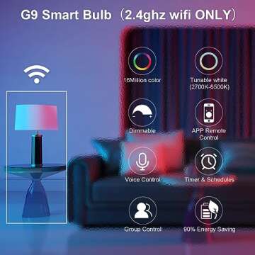 Show more The LEDEPLY G9 WiFi smart bulbs redefine your lighting experience with their innovative blend of technology and design. Built for modern households, these smart bulbs integrate seamlessly with your home setup, being compatible with both Alexa and Google Home. You can control the lighting in your home using simple voice commands, providing a touch of ease and convenience in your daily life. Imagine arriving home after a long day, and with just the sound of your voice, the lights turn on, setting the perfect ambiance for relaxation.