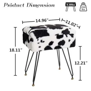 Leesingdo Vanity Stool Chair, Faux Fur Ottoman Foot Stool with Metal Legs & Adjustable Black Feet, Flip Top Storage Makeup Stool with Soft Padded Seat, Foot Rest for Makeup Room Bedroom, Cow