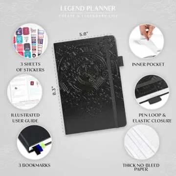 Show moreTransform your life with the **Legend Planner Hourly Schedule**, a sophisticated weekly and daily organizer designed to help you create the life you've always wanted. This stylish appointment book journal, featuring an elegant eco-leather hardcover in classic black, is not just a planner; it's a roadmap to success. With spacious monthly calendars and thoughtfully architected weekly pages, you can effortlessly set your goals, schedule tasks, and keep track of deadlines and appointments. The planner's undated pages allow for flexible planning, empowering you to start at any time of the year without restrictions or wasted pages.