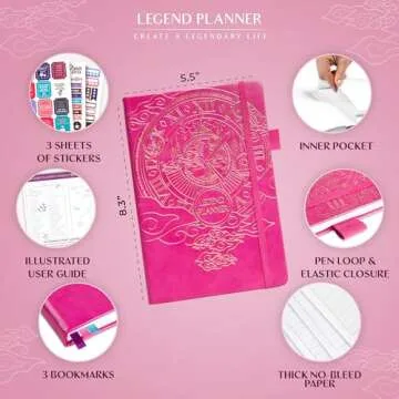 ... Show more Introducing the Legend Planner, the ultimate undated goal-setting planner designed to transform your daily routine and help you achieve your dreams. This carefully crafted planner serves as your trusted companion, combining innovative layouts with motivational tools to enhance your productivity and foster a balanced lifestyle. With its stunning hot pink eco-leather cover and metallic embossed detail, it is not just a planner; it’s a chic accessory that you will love to show off.