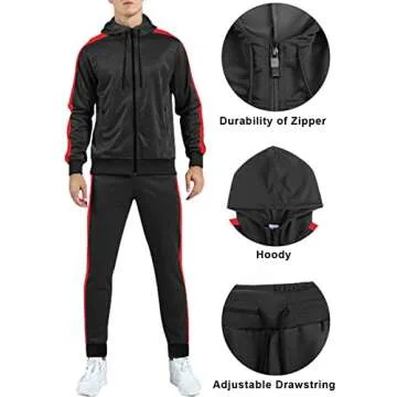 Show more Elevate your athletic wardrobe with the Leglocher Men's Tracksuits Athletic Sports Hooded Jogger Pants Casual Full Zip Jogging Sweatsuit. Designed in a striking black-red color combo, this medium-sized tracksuit symbolizes the perfect balance between style and functionality. Constructed from 95% polyester and 5% spandex, this premium set not only ensures a soft and cozy feel against your skin but also provides exceptional breathability, making it ideal for workouts and casual outings alike.